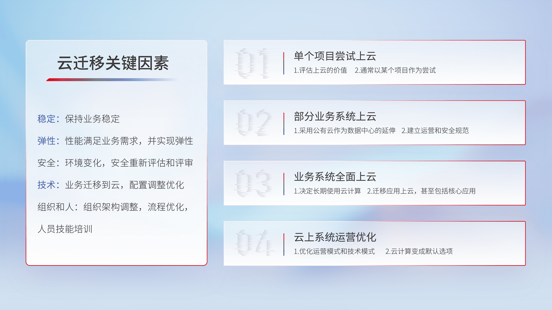 结合实际业务,,,从规划设计、、云平台选型、、、云原生改造、、数据迁移、、、集成交付,,,,迁移全过程为客户识别最佳上云路径,,,,做好风险识别管理,,,设计网络架构、、、、身份权限、、、安全审计合规、、、操作审计、、日志审计、、监控告警策略、、、、多站点容灾设计等,,,,对云上基础设施进行整体规划,,,,提升IT治理水平,,,以满足弹性、、高可用、、、高性能的需求。。。。
