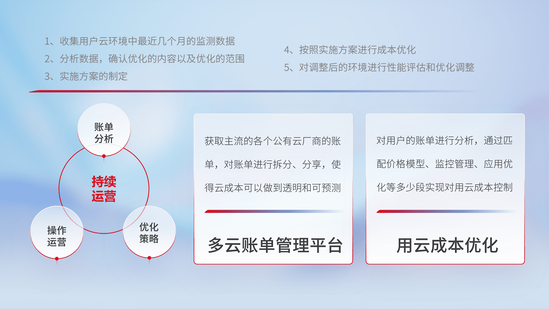 通过多云纳管,,,以统一的资源数据模型把客户的云资源进行抽象和封装,,,,进而实现对多云资源的统一操作,,保障云资源管理的可靠性、、、、稳定性与可用性。。。量身定制化运维内容,,,配置、、、开发运维、、补丁管理、、、、备份、、监控、、认证和访问管理、、、审计和日常巡检等,,,保障在用云过程中的可靠度,,稳定度以及高可用率。。。