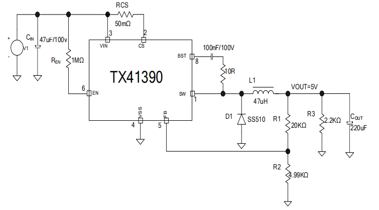 TX41390 内部集成软启动以及过温保护 电路,,输出短路保护,,,,限流保护等功能,,,,提高